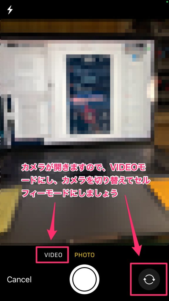4.カメラが開きますので、VIDEOモードにして、カメラもセルフィーモードに変えましょう