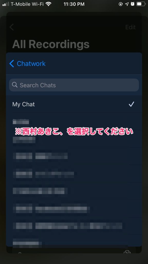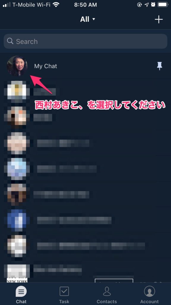 1.チャットワーク・アプリを開き、西村あきこ、を選択してください。