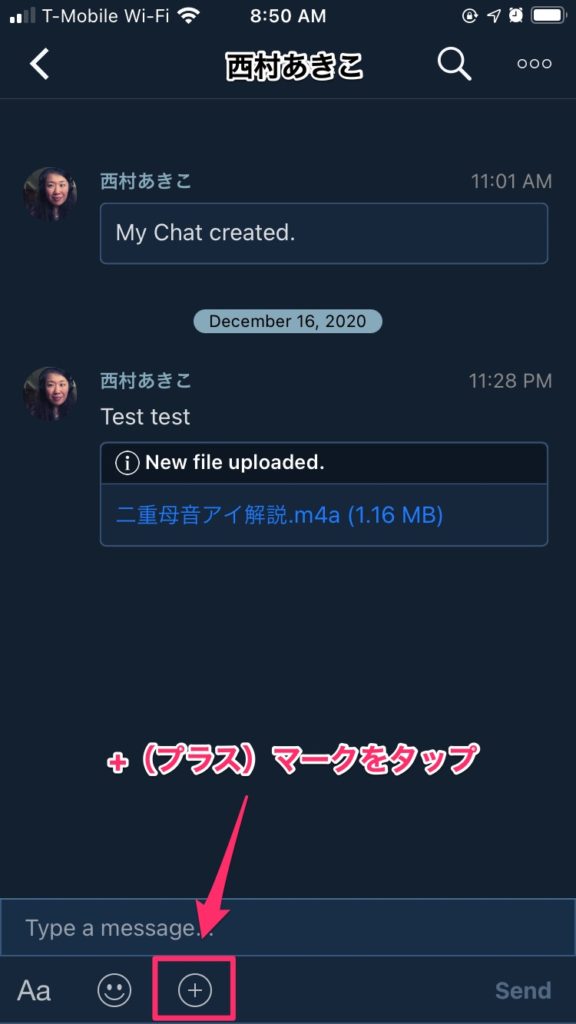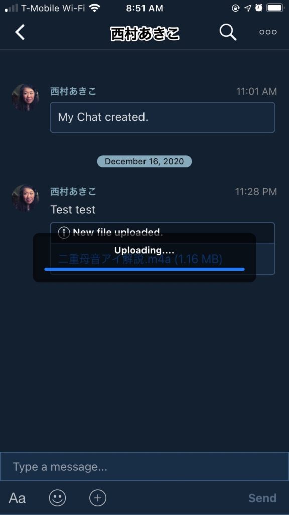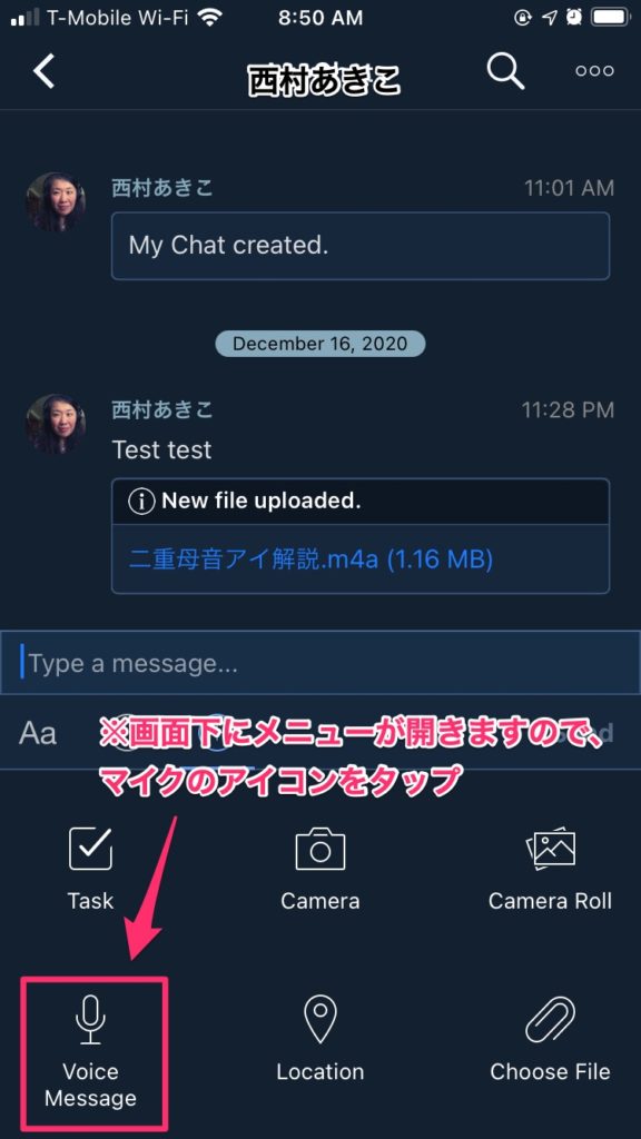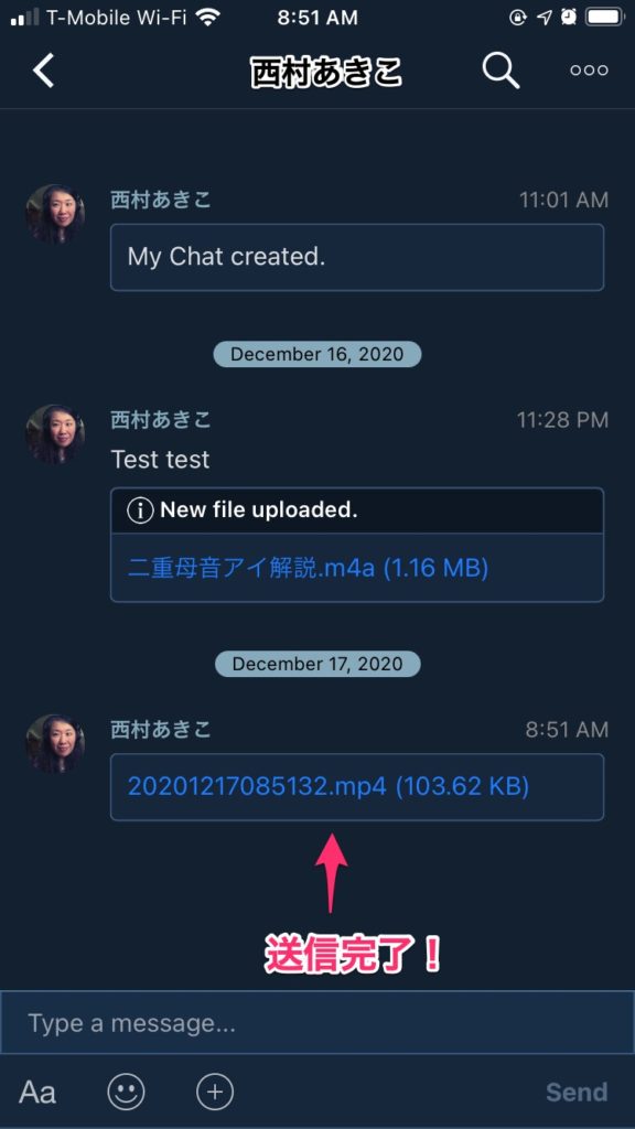 4.音声ファイルの送付先を選択します、西村あきこ、を選択、さらにメッセージのところに音声ファイルの内容も合わせて書いて送ってください。(例)「Lesson1の課題です」